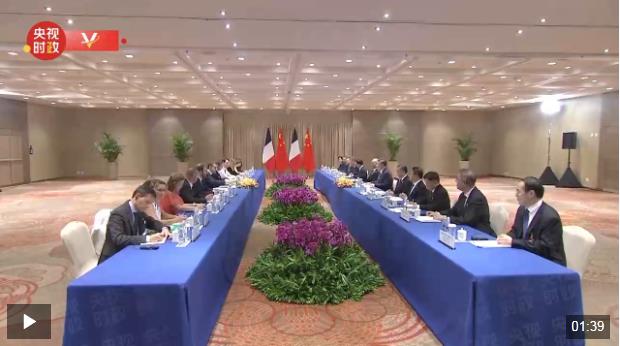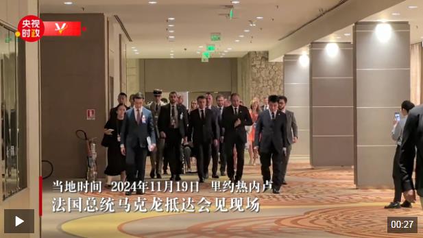 當地時間11月19日,國家主席習近平在里約熱內盧出席二十國集團領導人峰會期間會見法國總統馬克龍。
