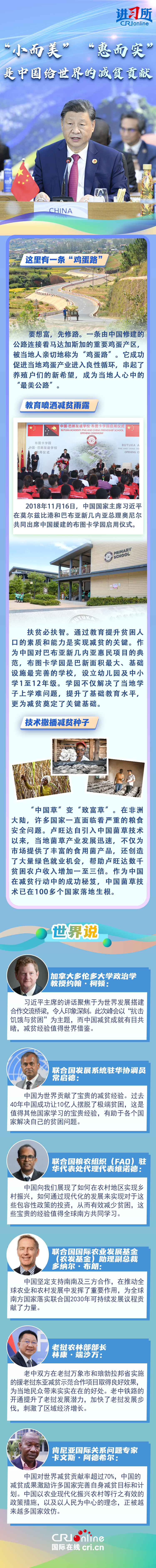 “世界繁榮穩(wěn)定不可能建立在貧者愈貧、富者愈富的基礎(chǔ)之上?!苯陙?,中國(guó)一直在用實(shí)際行動(dòng)與世界分享脫貧經(jīng)驗(yàn):與東盟國(guó)家共同開展鄉(xiāng)村減貧推進(jìn)計(jì)劃,在非洲開展基礎(chǔ)設(shè)施建設(shè)和農(nóng)業(yè)、醫(yī)療等技術(shù)合作援助項(xiàng)目,在拉美援建農(nóng)業(yè)技術(shù)中心......一批批“小而美”“惠而實(shí)”的民生項(xiàng)目落地生根,幫助當(dāng)?shù)孛癖姅[脫貧困。多國(guó)人士表示,中國(guó)成功打贏脫貧攻堅(jiān)戰(zhàn)具有世界意義,不僅為發(fā)展中國(guó)家提供了借鑒經(jīng)驗(yàn),更有助于推動(dòng)建設(shè)一個(gè)共同發(fā)展的公正世界。
