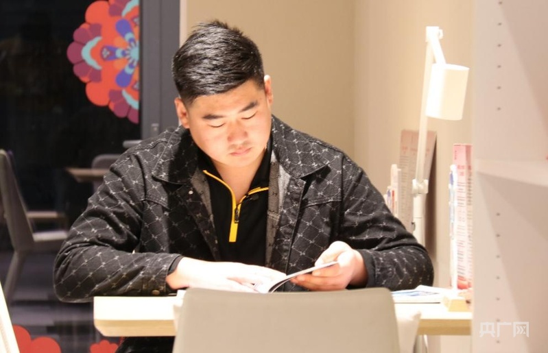 吳濤在共享圖書館看書(央廣網記者 唐奇云 攝)