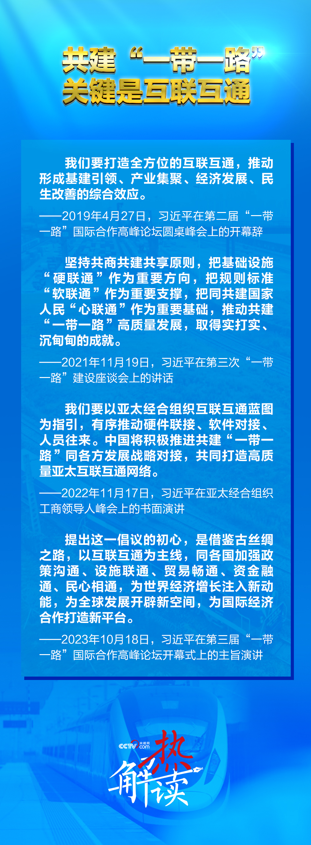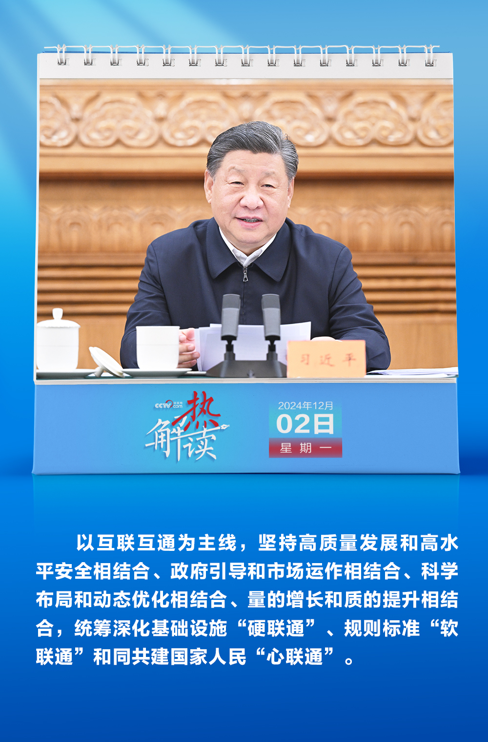 “統(tǒng)籌深化基礎(chǔ)設(shè)施‘硬聯(lián)通’、規(guī)則標(biāo)準(zhǔn)‘軟聯(lián)通’和同共建國家人民‘心聯(lián)通’”,“完善‘硬聯(lián)通’、‘軟聯(lián)通’、‘心聯(lián)通’協(xié)調(diào)推進(jìn)機(jī)制”。12月2日,習(xí)近平總書記在第四次“一帶一路”建設(shè)工作座談會上對深化三個“聯(lián)通”再作部署。