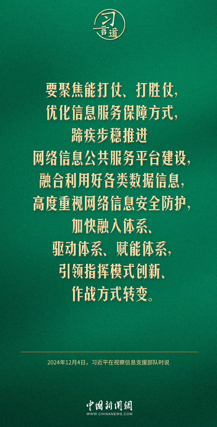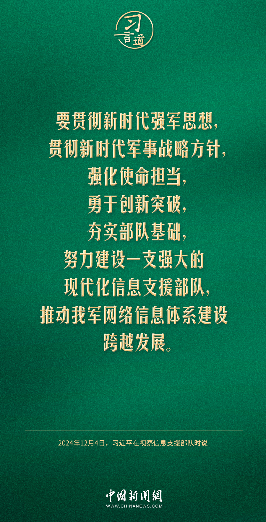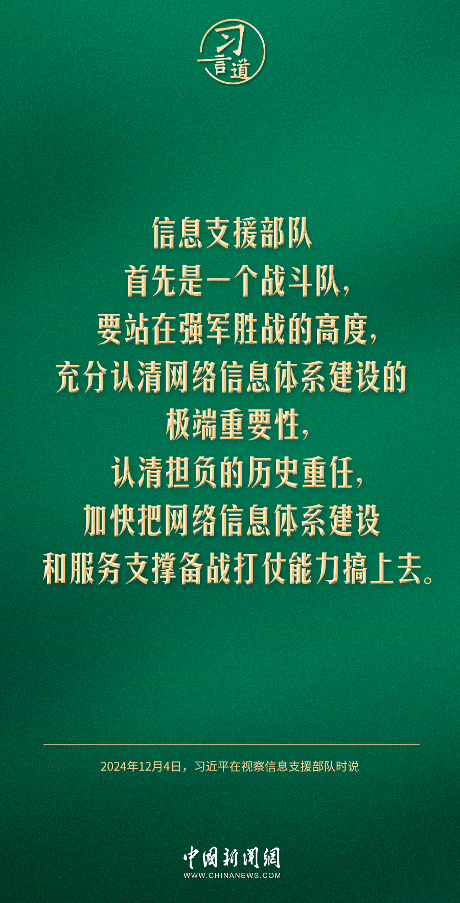 中共中央總書記、國(guó)家主席、中央軍委主席習(xí)近平4日視察信息支援部隊(duì),代表黨中央和中央軍委,對(duì)信息支援部隊(duì)第一次黨代表大會(huì)的召開(kāi)表示熱烈祝賀,向信息支援部隊(duì)全體官兵致以誠(chéng)摯問(wèn)候。習(xí)近平指出——
