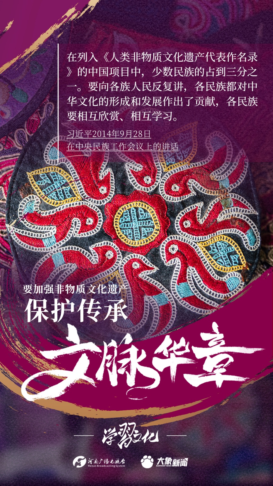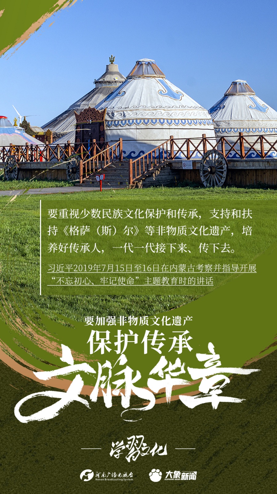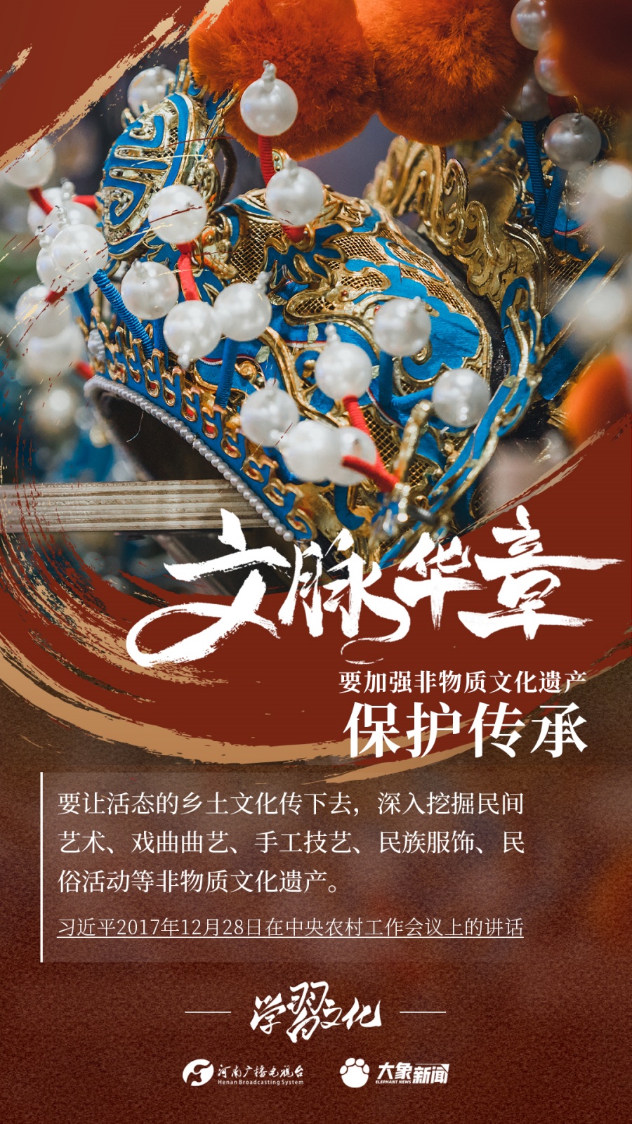 非物質(zhì)文化遺產(chǎn)是中華優(yōu)秀傳統(tǒng)文化的重要組成部分,是中華文明綿延傳承的生動(dòng)見(jiàn)證,是我國(guó)各族人民寶貴的精神財(cái)富。習(xí)近平總書記十分關(guān)心非物質(zhì)文化遺產(chǎn)的保護(hù)傳承,多次強(qiáng)調(diào)“要扎實(shí)做好非物質(zhì)文化遺產(chǎn)的系統(tǒng)性保護(hù)”“培養(yǎng)好傳承人”等。大象新聞為您梳理,邀您一起學(xué)習(xí)、領(lǐng)悟、踐行。