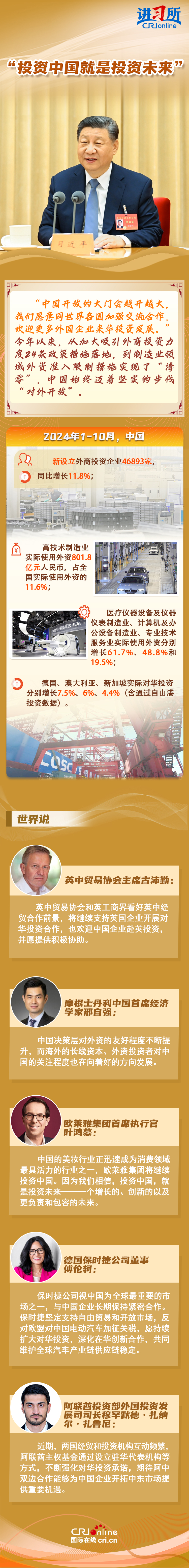 “中國是實(shí)干家、行動派?!苯衲暌詠恚瑥牧?xí)近平主席的歐洲之行到拉美之行,再到四天前在北京會見主要國際經(jīng)濟(jì)組織負(fù)責(zé)人,習(xí)近平一直強(qiáng)調(diào),中國的發(fā)展將給世界帶來巨大機(jī)遇。據(jù)聯(lián)合國貿(mào)易和發(fā)展會議不久前發(fā)布的《世界投資報告2024》中文版顯示,中國吸引外資的結(jié)構(gòu)不斷優(yōu)化、質(zhì)量不斷提高,多位政商界人士也認(rèn)為中國是一個非常有前景的市場,投資中國就是投資未來。
