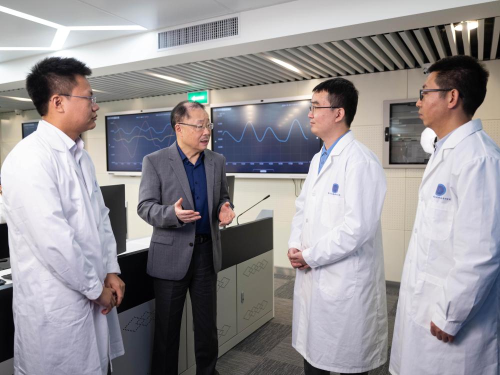 12月4日,澳門空間技術與應用研究院院長張可可(左二)和“澳科一號”衛(wèi)星項目助理研究員尹亮(右二)交流。新華社發(fā)(張金加 攝)