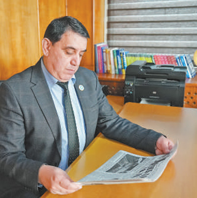 蘇赫羅普·勞夫佐達閱讀塔吉克斯坦《人民論壇報》與中國相關(guān)的報道。劉帥杰攝