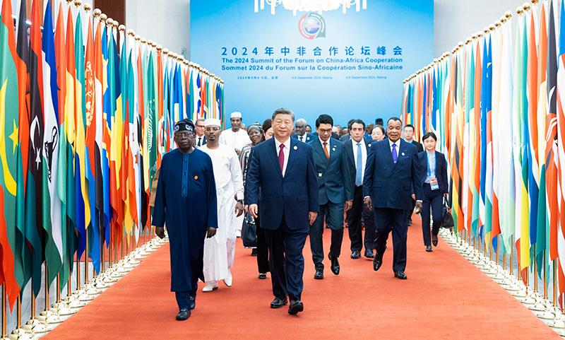 △2024年9月5日,習近平主席在北京人民大會堂出席中非合作論壇北京峰會開幕式并發(fā)表主旨講話。這是習主席同外方領導人共同步入會場。
