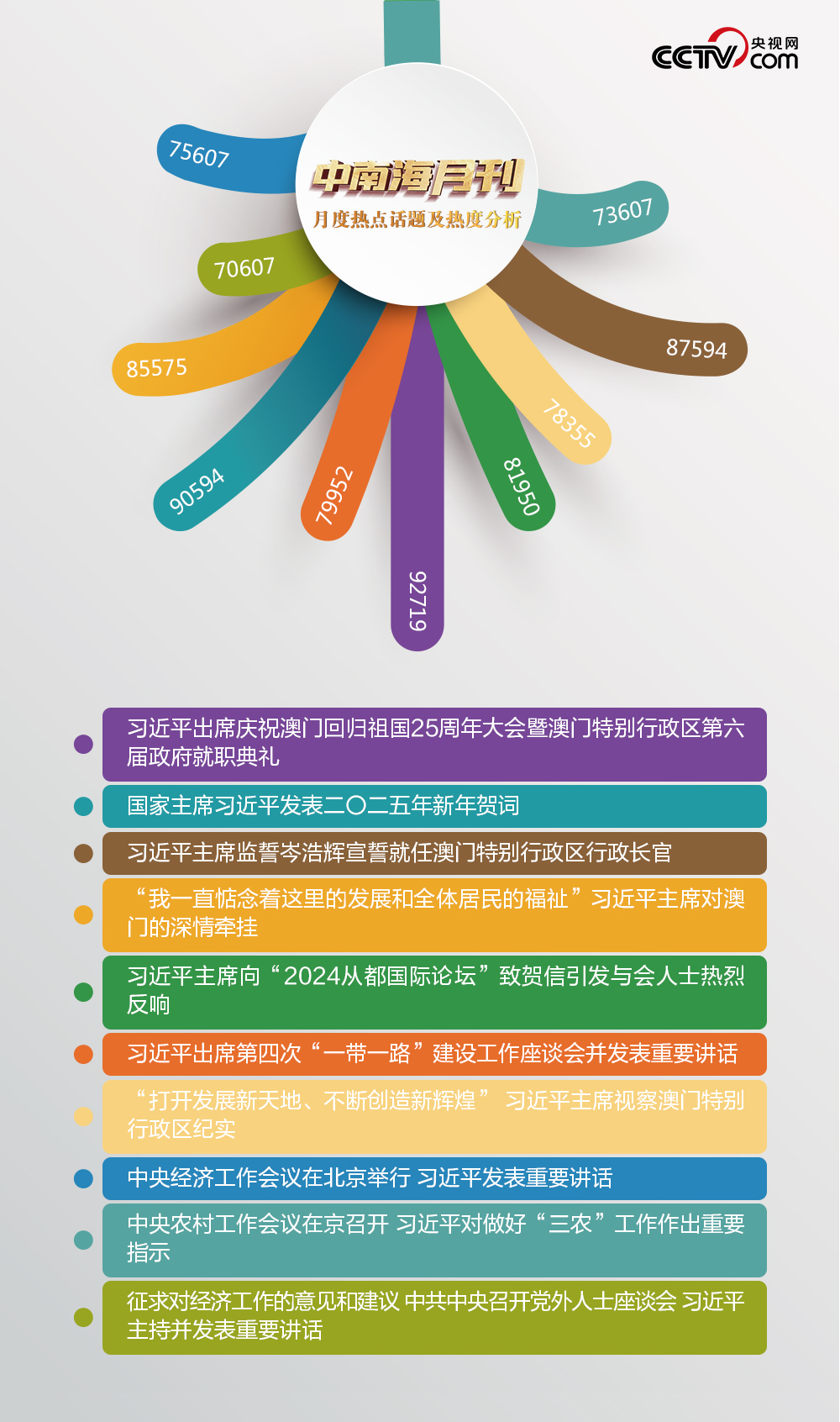 南海風(fēng)起,百舸爭流。盛世蓮花,灼灼生華。央視網(wǎng)“智聞”系統(tǒng)提取分析2024年12月全網(wǎng)時政新聞熱點,習(xí)近平主席澳門之行吸引全網(wǎng)關(guān)注。