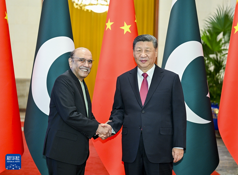 2月5日下午,國家主席習近平在北京人民大會堂同來華進行國事訪問的巴基斯坦總統(tǒng)扎爾達里舉行會談。這是習近平同扎爾達里握手。新華社記者 李學仁 攝