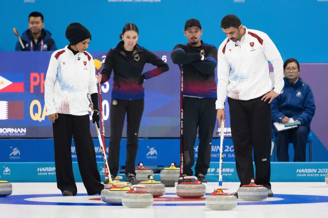 2月5日,亞冬會冰壺混雙循環(huán)賽B組第3輪比賽中,菲律賓隊(duì)11比3戰(zhàn)勝卡塔爾隊(duì)。