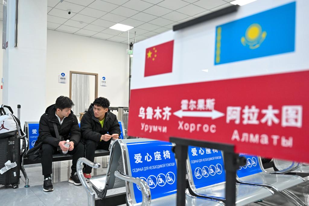 1月8日,在烏魯木齊陸港國際客運(yùn)站,伊利亞索夫·安瓦爾(左)和同學(xué)在候車廳等候前往阿拉木圖的國際班車。新華社記者丁磊 攝