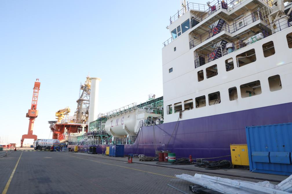 1月2日,大連船舶海洋工程有限公司廠區(qū)內(nèi)碼頭上,一輛LNG運(yùn)輸卡車正在為“北極探路者”運(yùn)輸船進(jìn)行保稅LNG燃料加注。