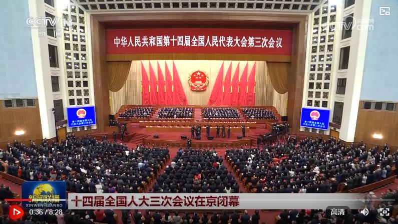 第十四屆全國人民代表大會第三次會議在圓滿完成各項議程后,11日下午在北京人民大會堂閉幕。大會批準(zhǔn)政府工作報告、全國人大常委會工作報告等。大會通過關(guān)于修改全國人民代表大會和地方各級人民代表大會代表法的決定,國家主席習(xí)近平簽署第45號主席令予以公布。