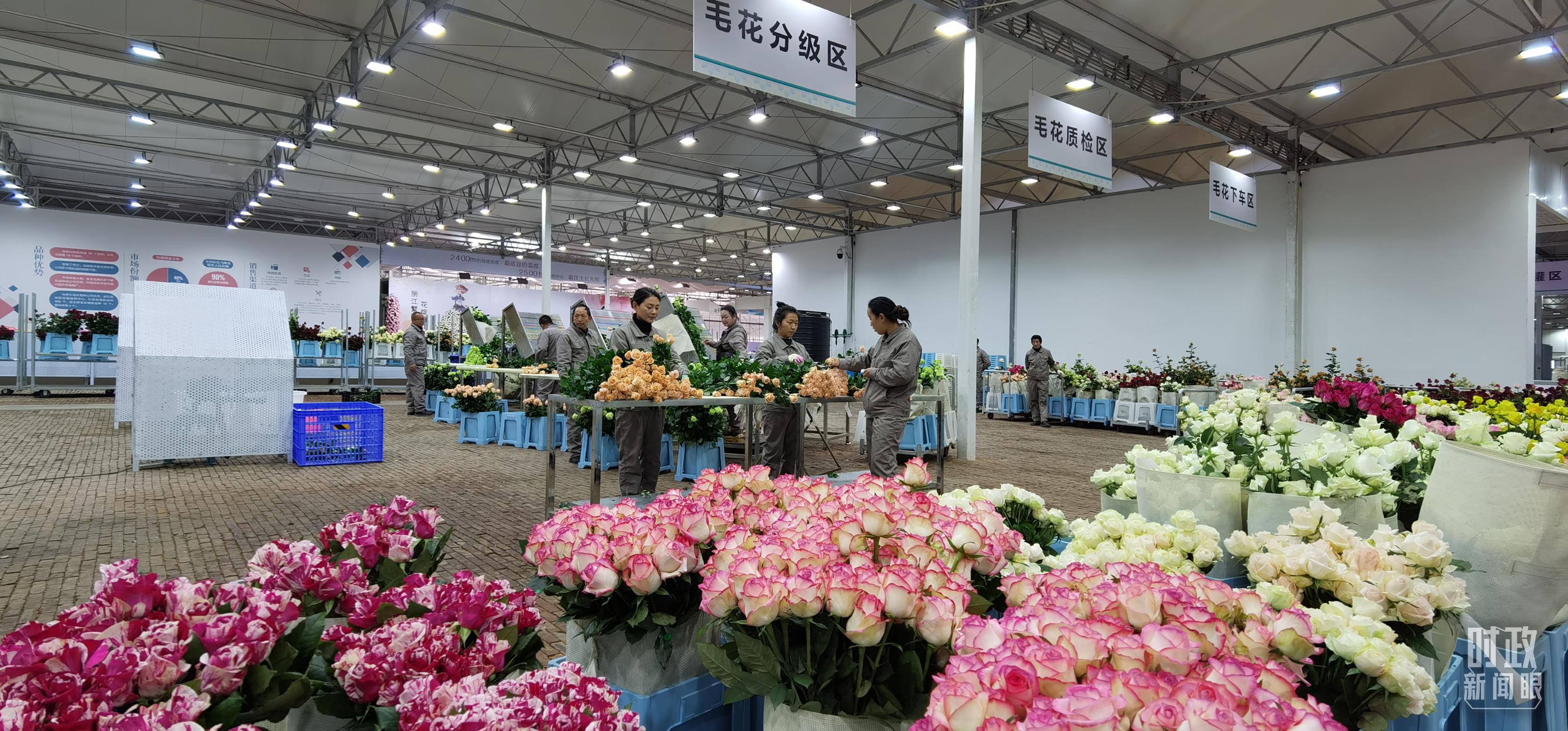 麗江現(xiàn)代花卉產(chǎn)業(yè)園內(nèi),工人正在分類整理鮮花。(總臺(tái)央視記者郭鴻拍攝)