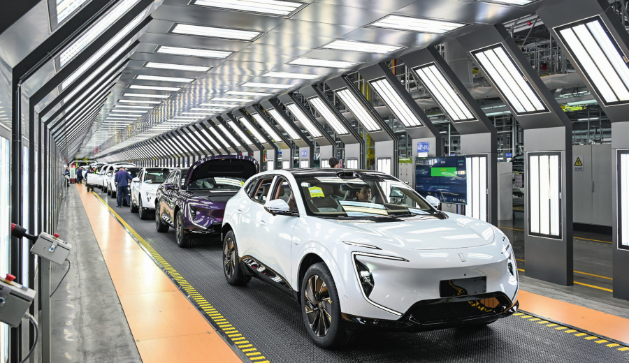 位于重慶市渝北區(qū)的長(zhǎng)安汽車數(shù)智工廠總裝車間拍攝的即將下線的新能源汽車(2025 年 3 月 6 日攝) 王全超攝 / 本刊