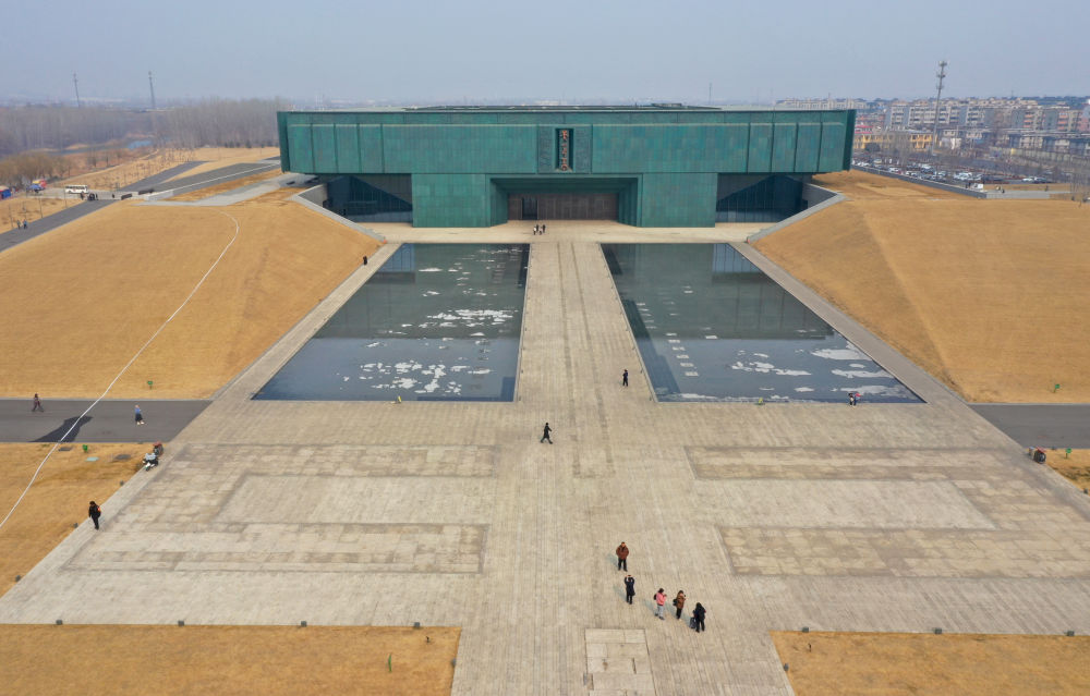 “商邑翼翼,四方之極?!蔽挥谔猩綎|麓的河南安陽(yáng)小屯村一帶,是殷墟遺址所在地。三千多年前,繁盛的城市文明、舉世矚目的文字文明以及高度發(fā)展的手工業(yè)等,共同構(gòu)筑了早期中國(guó)的華彩篇章。2024年2月,殷墟博物館新館正式開(kāi)館,成為首個(gè)全景式展現(xiàn)商文明的國(guó)家重大考古專題博物館(2025年2月21日攝,無(wú)人機(jī)照片)。
