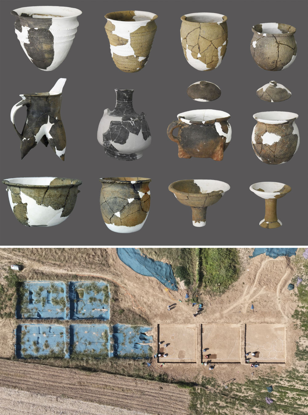 拼版照片:上圖為位于河南南陽(yáng)方城縣的八里橋遺址出土的陶器(河南省文物考古研究院供圖);下圖為八里橋遺址發(fā)掘現(xiàn)場(chǎng)(無(wú)人機(jī)照片,新華社記者袁月明2024年9月11日攝)。八里橋遺址是豫南地區(qū)已發(fā)現(xiàn)規(guī)模最大、等級(jí)最高的二里頭文化聚落,為探索夏文化地方城邑聚落形態(tài)、社會(huì)結(jié)構(gòu)提供了新線索。