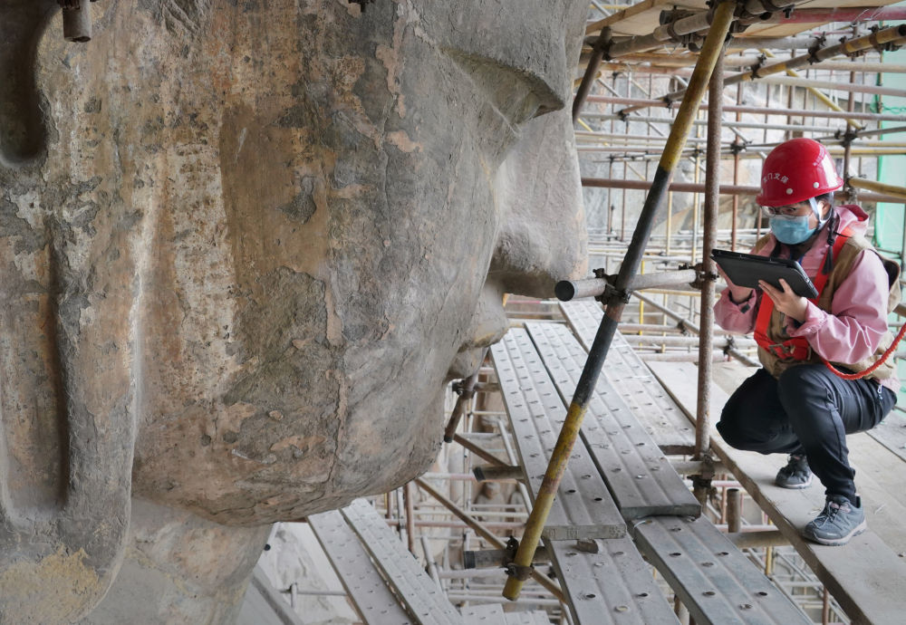 奉先寺位于河南洛陽(yáng)龍門(mén)西山南段,是龍門(mén)石窟開(kāi)鑿規(guī)模最大、最具代表性的摩崖像龕。2022年7月,龍門(mén)石窟奉先寺大型滲漏水治理和危巖體加固保護(hù)工程完工。這是工作人員在龍門(mén)石窟奉先寺進(jìn)行勘測(cè)作業(yè)(2022年4月14日攝)。