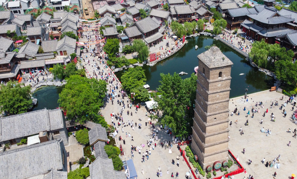 這是位于河南洛陽(yáng)的洛邑古城景區(qū)(2023年5月2日攝,無(wú)人機(jī)照片)。洛邑古城里精致的布景、各色表演和漢服妝造拍攝吸引大量游客前來(lái)。