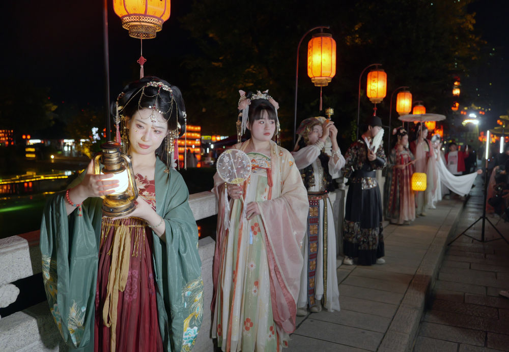 2023年10月24日,游客在洛陽(yáng)市洛邑古城身著漢服拍照留念。