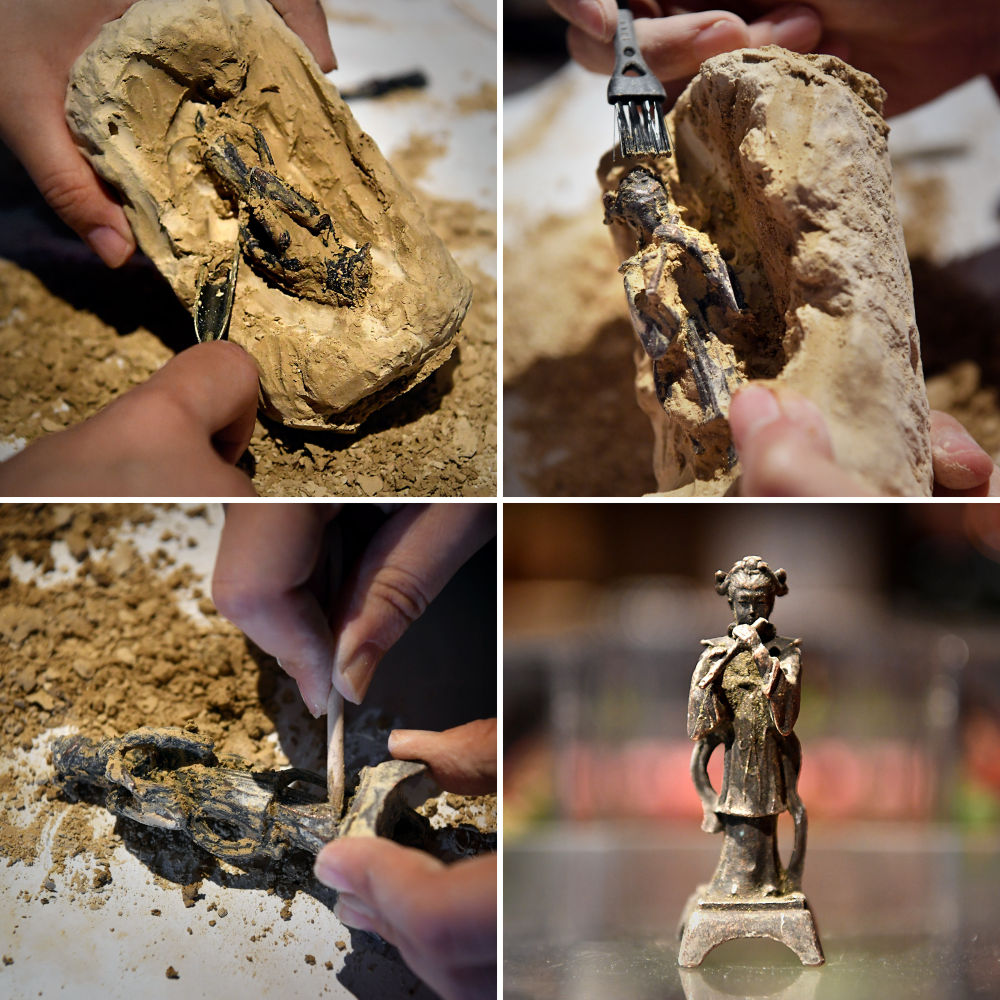 這是河南博物院推出的“考古盲盒”的“挖寶”過(guò)程(拼版照片,2022年5月17日攝)。