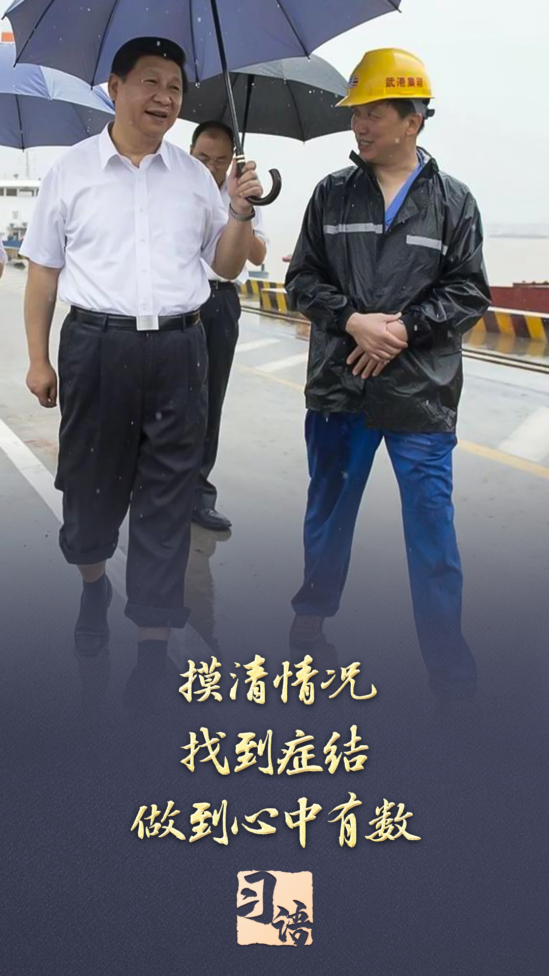 2013年7月,習近平總書記冒雨來到湖北武漢新港陽邏集裝箱港區(qū)考察,他卷起褲腿,打著雨傘,蹚著積水邊走邊看邊問。兩天后,在武漢主持召開部分省市負責人座談會時,習近平總書記強調(diào):“研究、思考、確定全面深化改革的思路和重大舉措,刻舟求劍不行,閉門造車不行,異想天開更不行,必須進行全面深入的調(diào)查研究。”