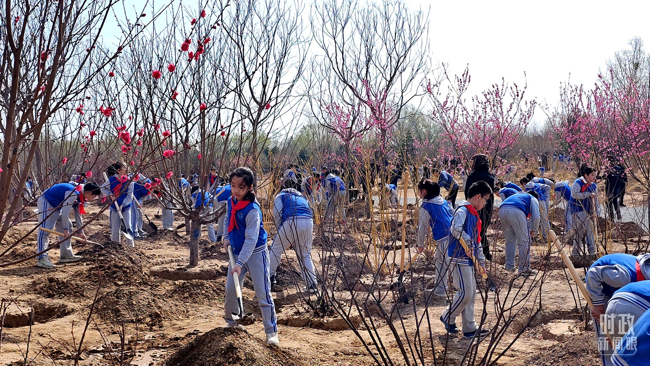 △少先隊(duì)員拿起鐵鍬參加義務(wù)植樹。(總臺央視記者范凱拍攝)
