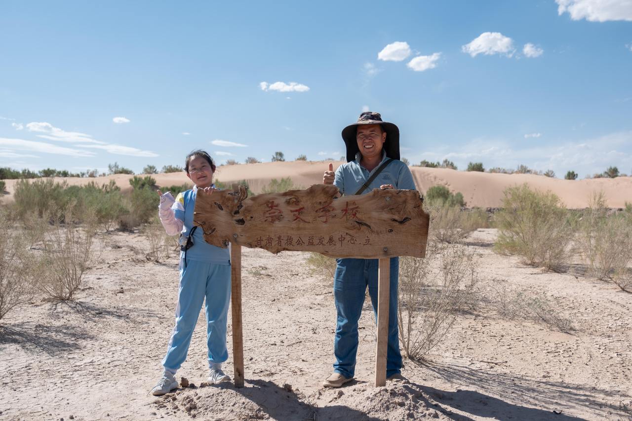 天地茫茫,站在“崇文林”的標(biāo)志旁,背后是巴丹吉林沙漠。前方的高山上,一座紀(jì)念碑高高佇立,上面書寫著習(xí)近平總書記在甘肅視察時(shí)強(qiáng)調(diào)的“確保民勤不成為第二個(gè)羅布泊”。