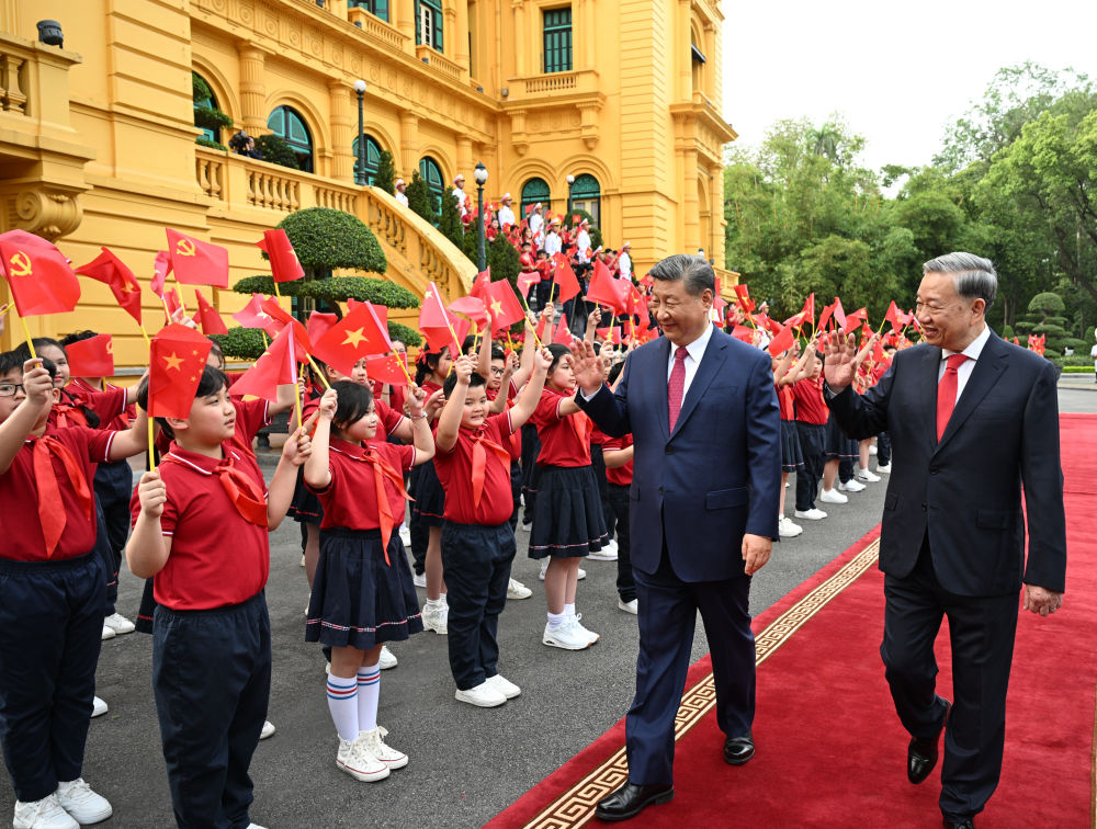越共中央總書(shū)記蘇林為對(duì)越南進(jìn)行國(guó)事訪(fǎng)問(wèn)的中共中央總書(shū)記、國(guó)家主席習(xí)近平舉行隆重歡迎儀式,兩位領(lǐng)導(dǎo)人在紅毯上并肩前行。