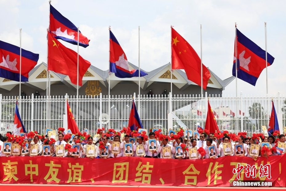 習近平抵達柬埔寨時,在停機坪現(xiàn)場,禮兵分列紅毯兩側,軍樂團奏起中柬兩國國歌,數(shù)百名當?shù)孛癖姄]舞中柬國旗,歡迎鐵桿朋友再次到訪。