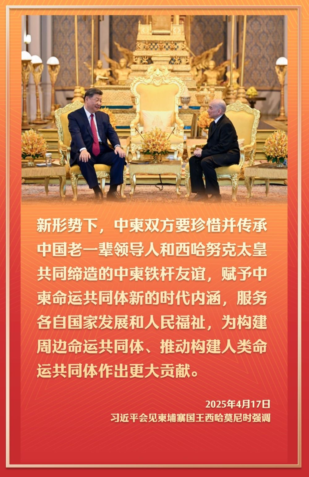 2016年10月13日,國家主席習近平在金邊看望柬埔寨太后莫尼列。莫尼列太后特意請習近平在西哈努克太皇生前常坐的椅子上就座。