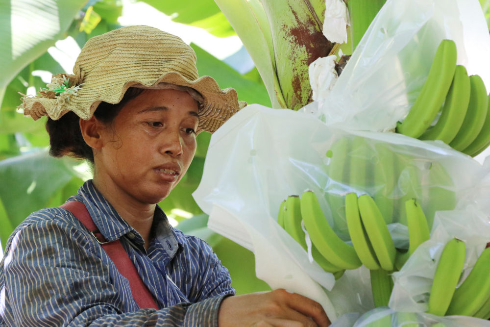 2020年7月17日,工人在柬埔寨桔井省的柬埔寨-中國熱帶生態(tài)農(nóng)業(yè)合作示范區(qū)給香蕉套袋。