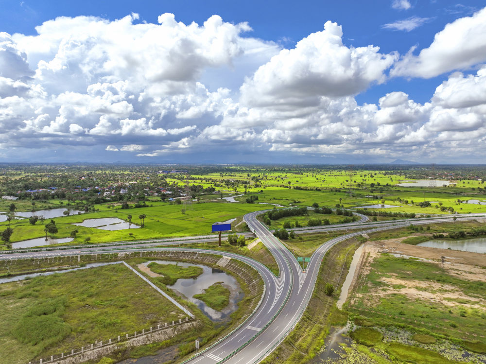 2024年9月25日在柬埔寨磅士卑省拍攝的金港高速公路(無人機照片)。連接柬埔寨首都金邊和最大深水海港西哈努克港的金港高速公路,是中柬共建“一帶一路”標志性項目。