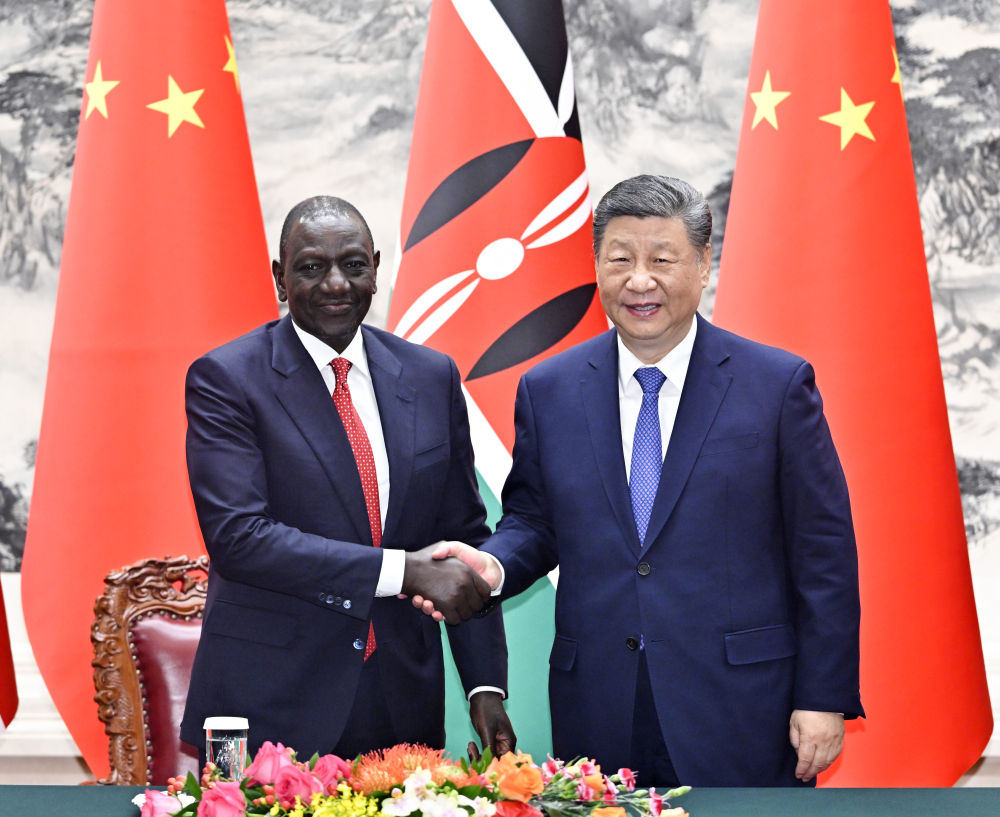 4月24日上午,國家主席習(xí)近平在北京人民大會堂同來華進行國事訪問的肯尼亞總統(tǒng)魯托舉行會談。這是習(xí)近平同魯托握手。