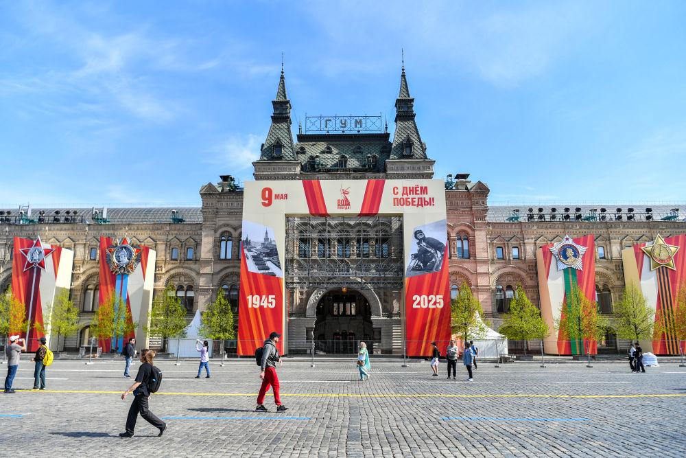 紀(jì)念蘇聯(lián)偉大衛(wèi)國戰(zhàn)爭勝利80周年慶典前夕,莫斯科街頭,寫有“勝利”字樣的旗幟隨風(fēng)飄揚。在路邊,以蘇聯(lián)衛(wèi)國戰(zhàn)爭歷史為主題的圖片展板和裝飾櫥窗吸引行人停下腳步,或合影留念,或瀏覽沉思。