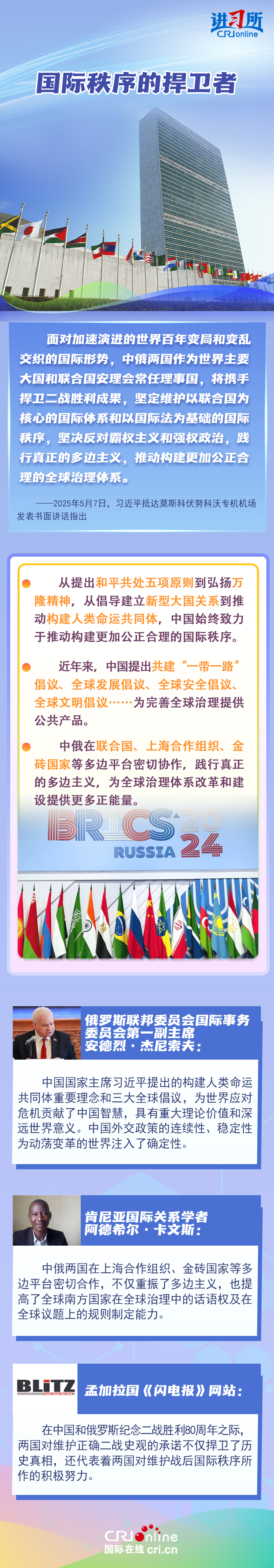 “兩國人民用鮮血和生命凝結(jié)的深厚情誼,如黃河之水奔騰不息,似伏爾加河寬廣深沉,成為中俄世代友好的不竭源泉?!苯衲晔侵袊嗣窨谷諔?zhàn)爭、蘇聯(lián)偉大衛(wèi)國戰(zhàn)爭暨世界反法西斯戰(zhàn)爭勝利80周年,也是聯(lián)合國成立80周年。在這一重要?dú)v史時間節(jié)點(diǎn),習(xí)近平主席此訪不僅為中俄關(guān)系發(fā)展注入強(qiáng)勁動力,也向世界宣示中俄兩國攜手捍衛(wèi)二戰(zhàn)勝利成果的堅(jiān)定意志。