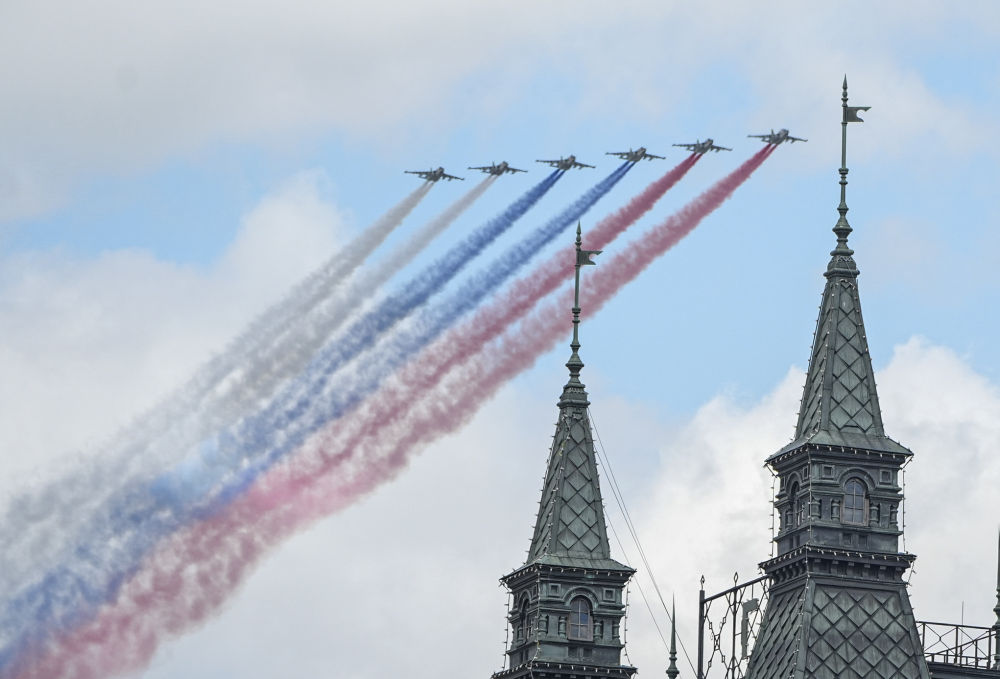 5月9日,在俄羅斯首都莫斯科,參加紀(jì)念蘇聯(lián)偉大衛(wèi)國(guó)戰(zhàn)爭(zhēng)勝利80周年閱兵式的戰(zhàn)機(jī)編隊(duì)拉煙飛行。新華社記者 賴(lài)向東 攝