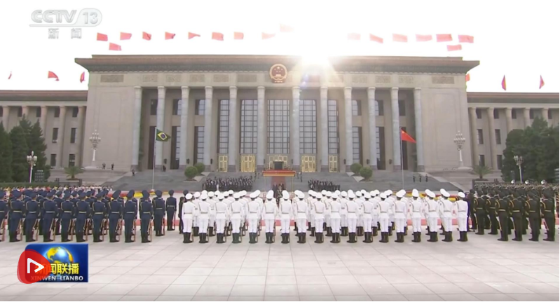 盧拉抵達(dá)時(shí),禮兵列隊(duì)致敬。習(xí)近平同盧拉登上檢閱臺(tái),軍樂團(tuán)奏中巴兩國國歌,天安門廣場(chǎng)鳴放禮炮21響。盧拉在習(xí)近平陪同下檢閱中國人民解放軍儀仗隊(duì),并觀看分列式。