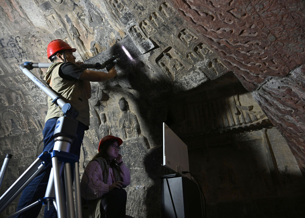 2025年4月9日,龍門(mén)石窟研究院工作人員在古陽(yáng)洞使用關(guān)節(jié)臂掃描儀對(duì)像龕進(jìn)行數(shù)字化掃描。