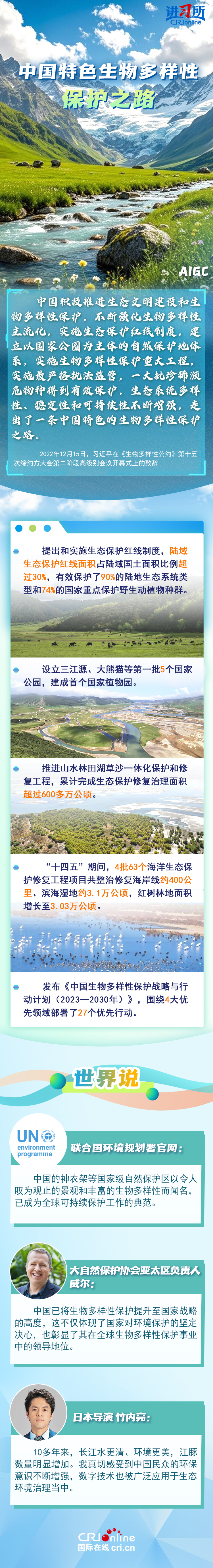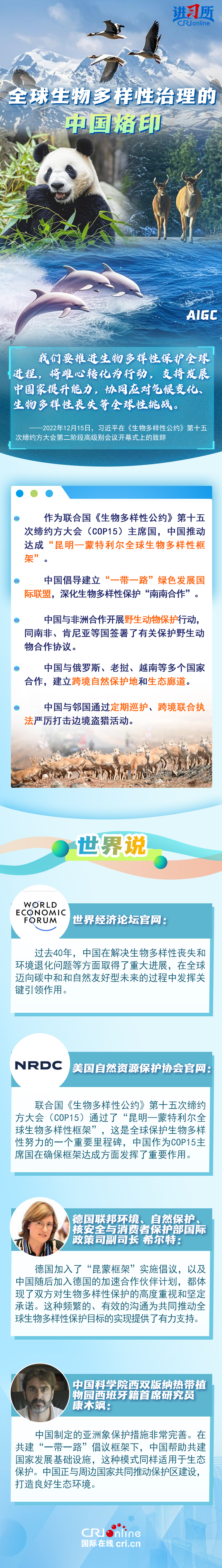 “心往一處想、勁往一處使,共建地球生命共同體?!弊鳛樽钤绾炇?、批準(zhǔn)《生物多樣性公約》的締約方之一,生物多樣性保護(hù)已經(jīng)上升為中國的國家發(fā)展戰(zhàn)略。國際人士表示,中國的一系列舉措體現(xiàn)出對生態(tài)環(huán)境保護(hù)的堅定決心,同時,中國依托共建“一帶一路”倡議等國際合作機(jī)制,為推動全球生物多樣性保護(hù)提供了有力支持,在邁向自然友好型未來的過程中發(fā)揮關(guān)鍵的引領(lǐng)作用。