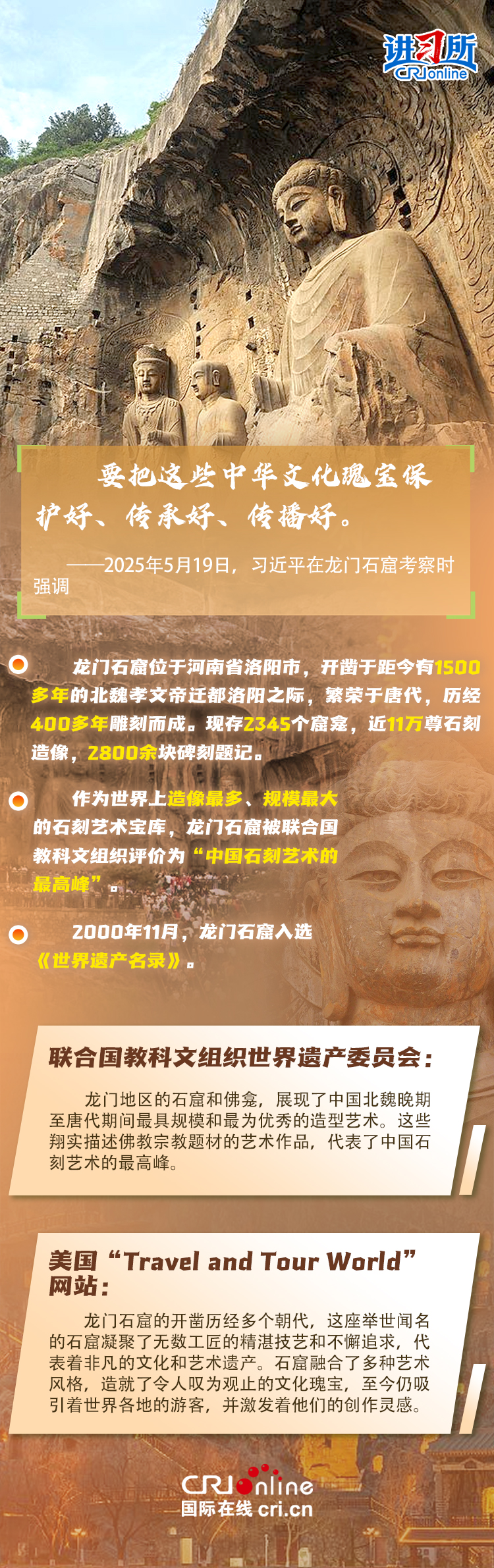 近日,中共中央總書記、國家主席習(xí)近平在河南洛陽考察調(diào)研。在龍門石窟,他察看石窟整體布局風(fēng)貌和代表性窟龕、造像,叮囑現(xiàn)場的文物保護工作者要把這些中華文化瑰寶保護好、傳承好、傳播好。