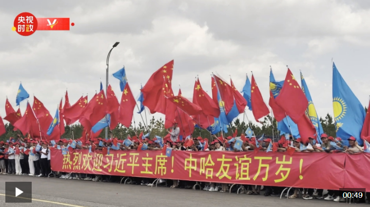 當(dāng)?shù)貢r(shí)間6月16日中午,習(xí)近平主席乘車從機(jī)場赴下榻飯店途中,中資企業(yè)和留學(xué)生代表聚集在道路兩旁,手持“熱烈歡迎習(xí)近平主席!”“中哈友誼萬歲!”等紅色橫幅。哈方直升機(jī)沿途護(hù)衛(wèi),熱烈歡迎習(xí)近平主席到訪。