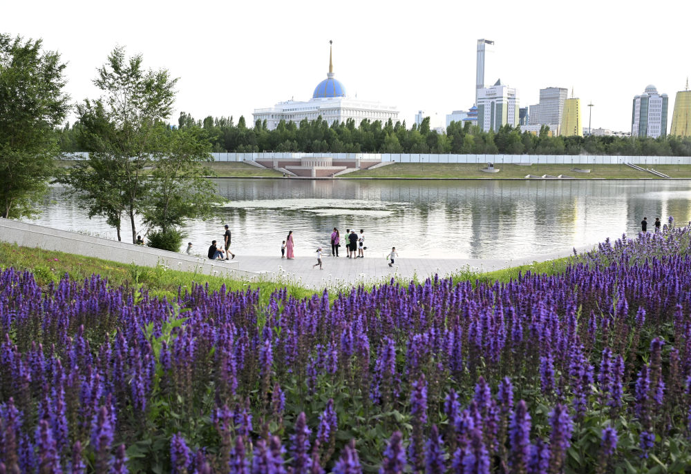 6月13日,人們在哈薩克斯坦首都阿斯塔納的伊希姆河畔休閑。 新華社記者 燕雁 攝