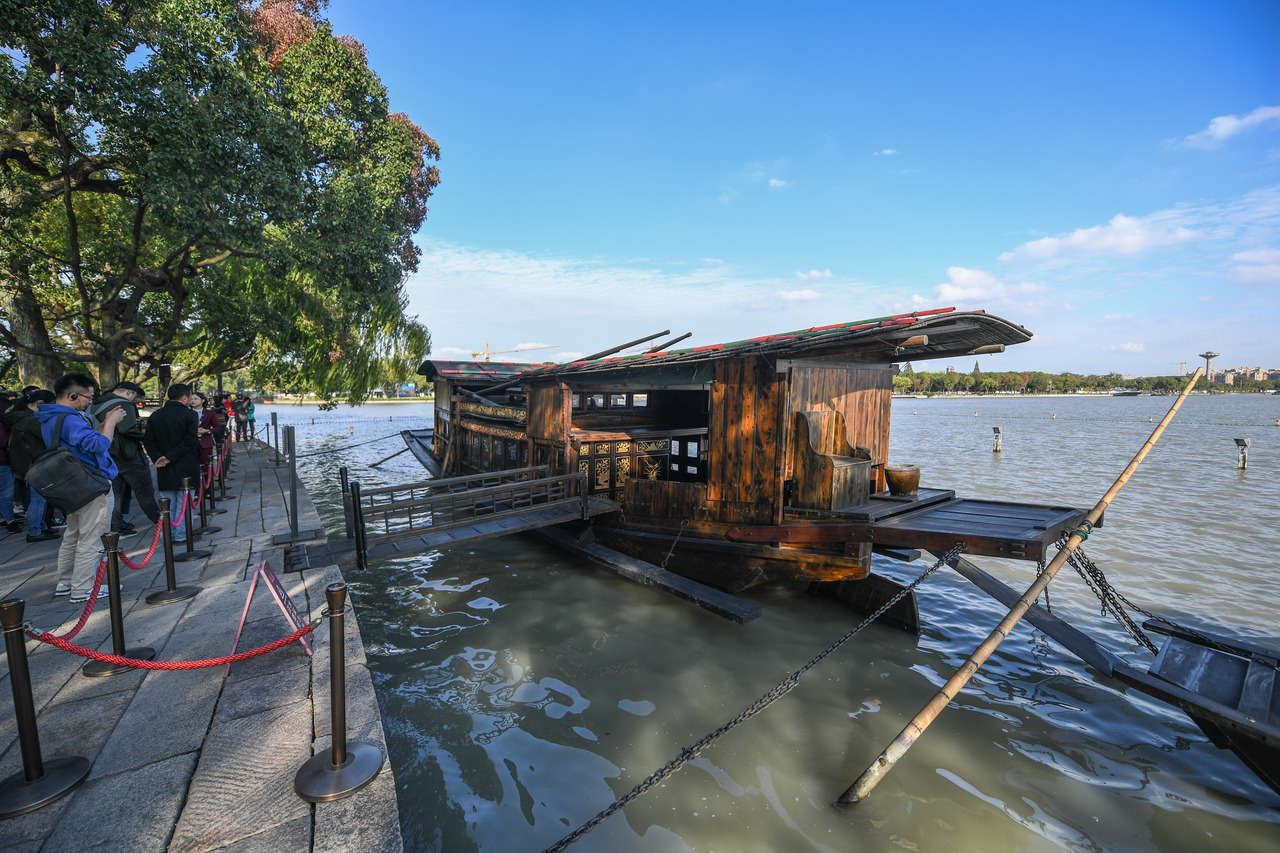湖心島畔,紅船靜臥,船頭朝著太陽升起的方向,生動還原了中國共產(chǎn)黨誕生時的場景。“習(xí)近平同志進了船艙,他有感而發(fā),說南湖是他向往已久的地方,這次來浙江工作,第一次就來南湖參觀,是非常有意義的事?!睍r任南湖革命紀(jì)念館講解員黃曉琦回憶。