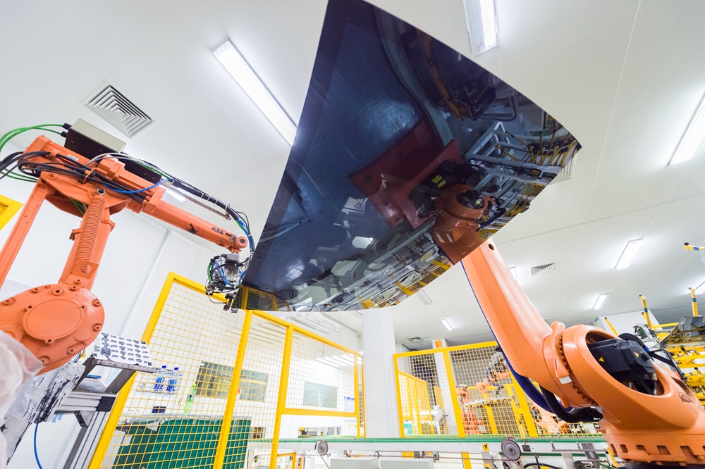 機械臂在福耀汽車玻璃智能工廠的車間生產玻璃產品