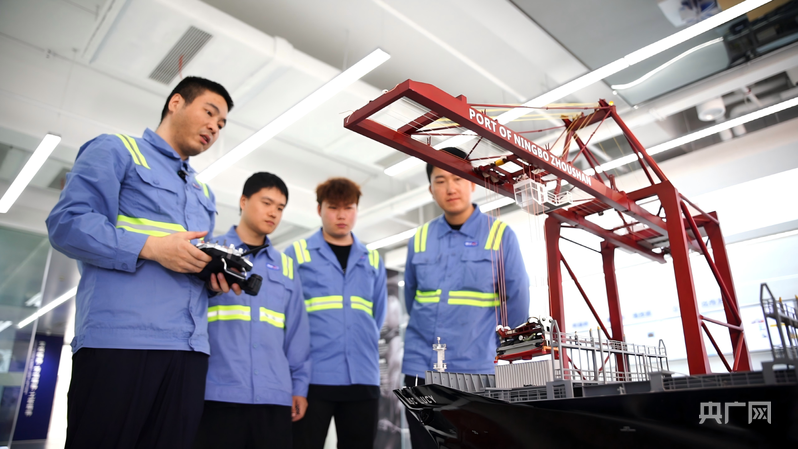 竺士杰(左一)為同事講解智能橋吊操作原理(央廣網(wǎng)記者 尚天宇 攝)