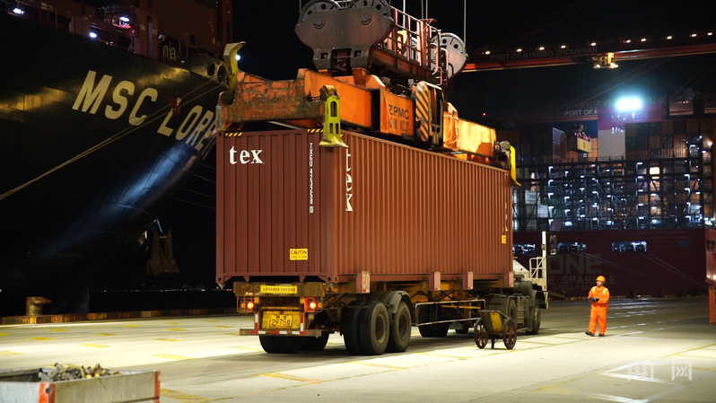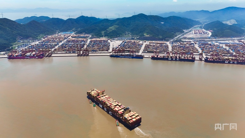 滿載貨物的“地中海洛雷托”號正緩緩靠泊寧波舟山港(央廣網(wǎng)記者 尚天宇 攝)