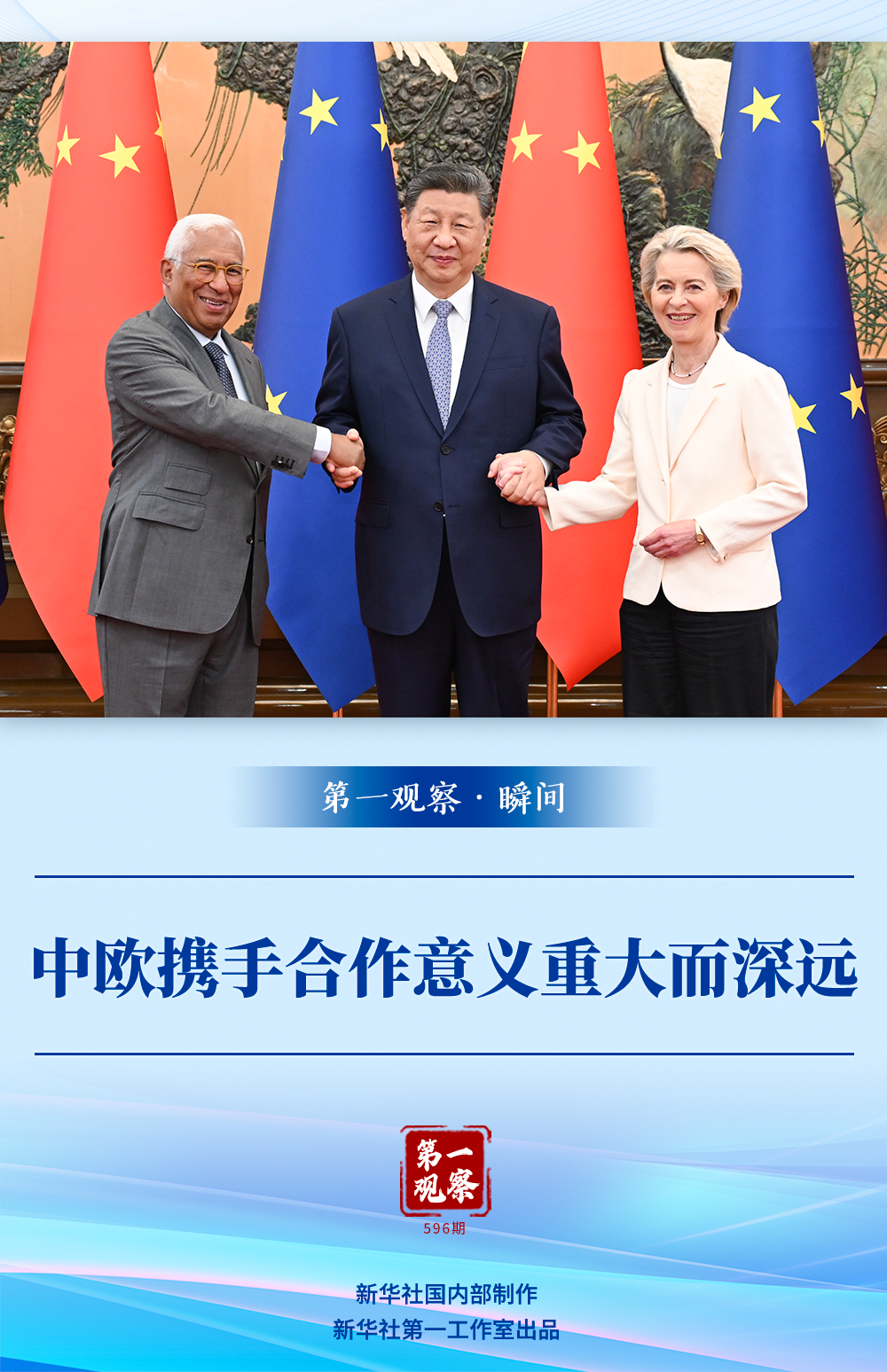 會見開始前的合影環(huán)節(jié),科斯塔主席、馮德萊恩主席主動向習近平主席伸出右手,三位領(lǐng)導(dǎo)人微笑著攜手面向記者合影留念。