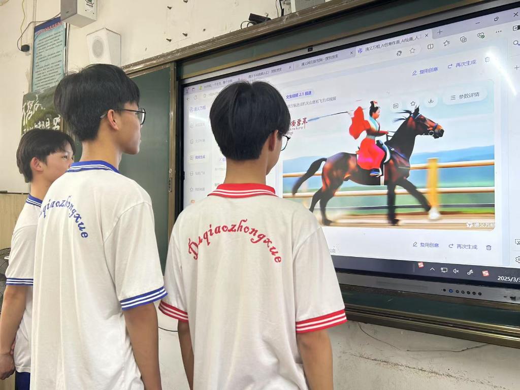 3月3日,廣西容縣容州鎮(zhèn)都嶠中學(xué)學(xué)生觀看老師使用人工智能大模型生成的海報(bào),感受語文課堂的互動(dòng)創(chuàng)新。(陳春仲 攝)