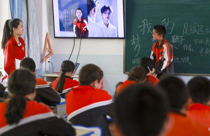 新疆克孜勒蘇柯?tīng)柨俗巫灾沃莅D什市哈拉峻鄉(xiāng)謝依特小學(xué),是一所主要面向柯?tīng)柨俗巫鍖W(xué)生的村級(jí)小學(xué),2022年8月成為該州首個(gè)西部計(jì)劃志愿者包校支教的試點(diǎn)學(xué)校。23名戍邊支教西部計(jì)劃志愿者服務(wù)隊(duì)的志愿者,在這所小學(xué)承擔(dān)著教書(shū)育人的工作。經(jīng)過(guò)近三年的支教服務(wù),學(xué)生的學(xué)習(xí)成績(jī)顯著提高,得到當(dāng)?shù)貜V泛認(rèn)可。這是2025年4月23日,支教教師高淑賢(左一)在班級(jí)里展示她為學(xué)生們制作的“AI夢(mèng)想職業(yè)照”。