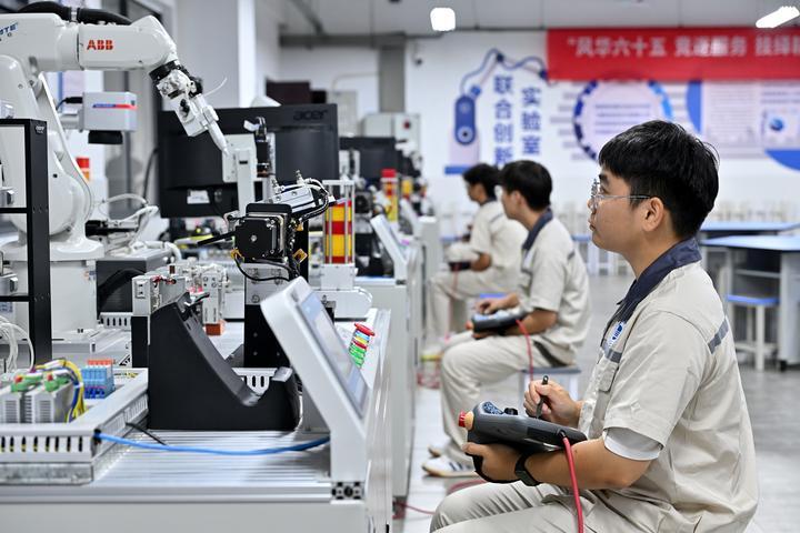 2024年7月26日,湖南鐵道職業(yè)技術(shù)學(xué)院的學(xué)生在工業(yè)機(jī)器人基礎(chǔ)應(yīng)用實(shí)訓(xùn)室接受工業(yè)機(jī)器人操控技能訓(xùn)練。教育部發(fā)布的數(shù)據(jù)顯示,近年來(lái),現(xiàn)代制造業(yè)、戰(zhàn)略性新興產(chǎn)業(yè)和現(xiàn)代服務(wù)業(yè)70%以上的新增一線從業(yè)人員來(lái)自職業(yè)院校。職業(yè)院校已經(jīng)成為培養(yǎng)大國(guó)工匠、能工巧匠、高技能人才的主陣地。
